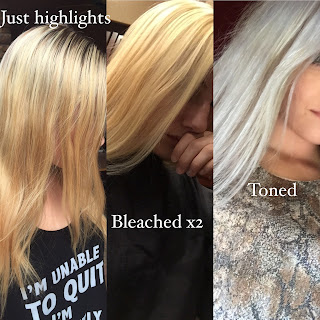 First of all, this has been a very long and slow process. About two years ago I started getting really fascinated by pastel hair colors. I started thinking about what I would look like if I did it and how I could get to it. Eventually I started the blonde process of just some highlights and making them heavier each time I went in to get my hair done. I was set back for awhile because I decided to do ombré for a few months. About a few months ago I got it to the blonde I wanted it to be and just let it be. Then about three days ago, me being the impulsive person I am, I decided to go silver. I thought hey why not, might as well try something new. So with my mom having a salon license we were able to use some nice bleach. I 100% recommend going to a professional for the bleaching process. We used Goldwell's Silk Lift with the Goldwell Silk Lift 30 Volume Developer. We ended up doing this process twice... in one day... yes I know that's bad. From there, we did our first round of toning with Goldwell's TopChic color in 11SV. Unfortunately, this did not get my hair to the color I wanted it to be. So the next day we purchased a Wella toner in the color T18, formally known as White Lady. To say the least, I am absolutely obsessed with the way my hair turned out.